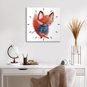 - A round glass clock 30x30 cm with a cute drawing of a fox in a blue scarf on a white background, perfect for a children's room and cozy interiors.
