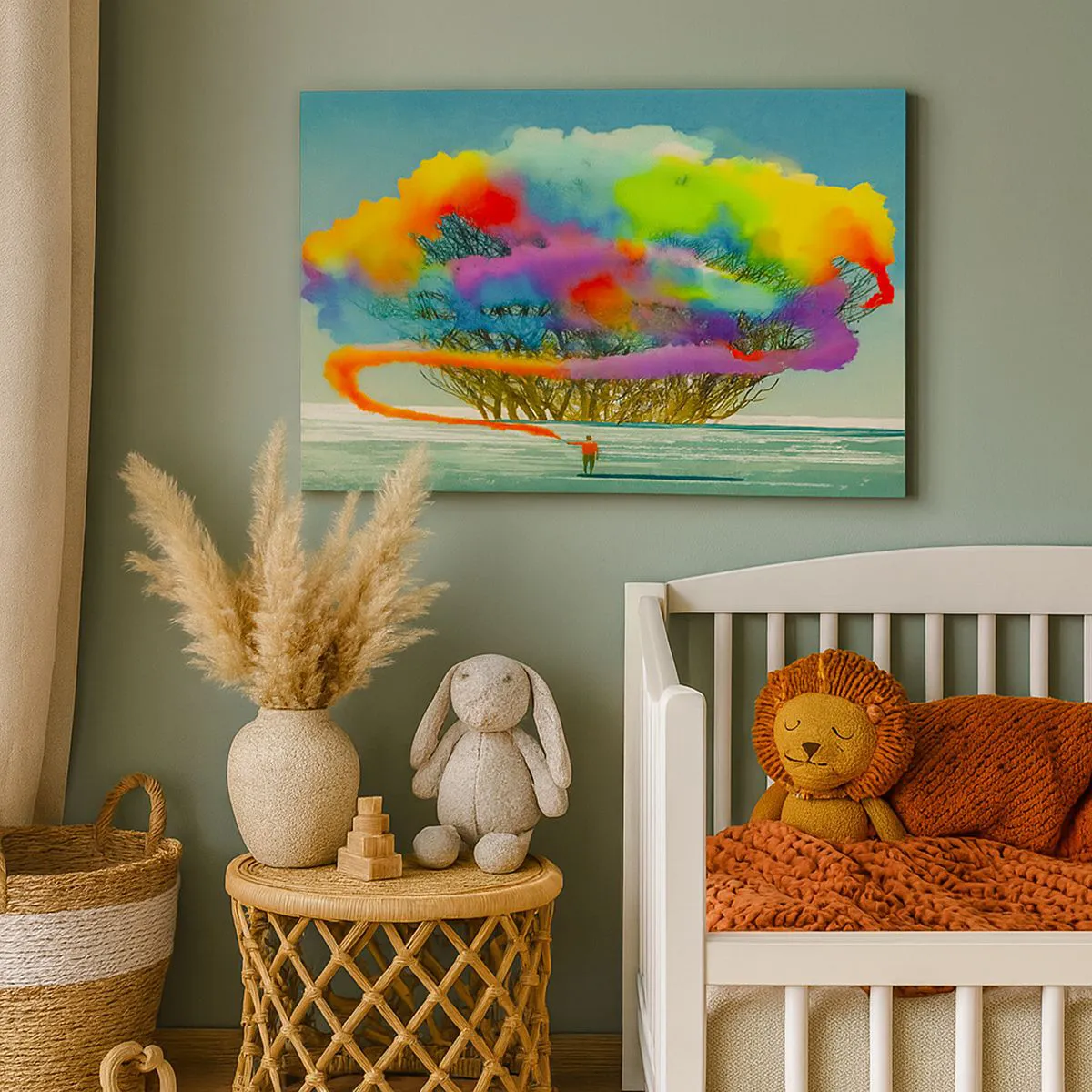 The canvas is stretched over the frame. The sides and edges of the picture are printed to form a continuation of the image. The painting is ready to hang on the wall. Each product comes with a hanger attached to the frame and a mounting kit (screw + wall plug).