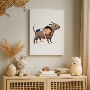 The canvas is stretched over the frame. The sides and edges of the picture are printed to form a continuation of the image. The painting is ready to hang on the wall. Each product comes with a hanger attached to the frame and a mounting kit (screw + wall plug).