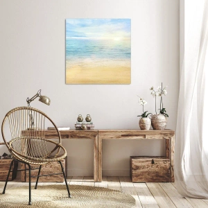 - The painting depicts a beach with a turquoise sea and fine sand, framed by a bright, sunny sky. Ideal as an interior decoration, it brings peace, harmony, and a holiday atmosphere.
