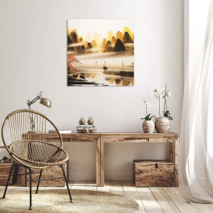 The motifs of mountains and rivers, so characteristic of Far Eastern art, have been captured with exceptional precision. Delicate shades and subtle color transitions give the composition lightness and harmony, introducing an atmosphere of peace and reflection to the interior. This painting perfectly complements minimalist, modern, or classic interiors, adding character and sophistication.