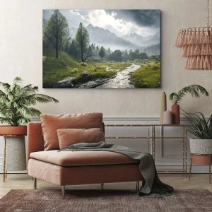 The canvas is stretched over the frame. The sides and edges of the picture are printed to form a continuation of the image. The painting is ready to hang on the wall. Each product comes with a hanger attached to the frame and a mounting kit (screw + wall plug).