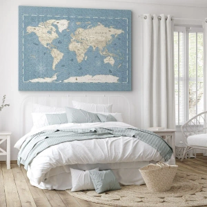 The "World at your fingertips" canvas print is the perfect choice for travel enthusiasts and those seeking geographical inspiration. The world map, rendered in subtle, pastel shades of blue and beige, delights with its vintage aesthetic, giving it a unique character.