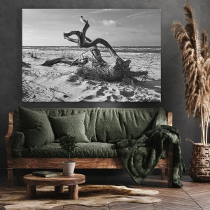 - The "Sea Sculpture" painting depicts a black-and-white landscape with a dead tree on a sandy beach by the sea. Perfect for minimalist and stylish interiors. The painting measures 70x50cm in a horizontal format.