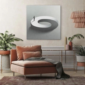 "And be wise here" is an extraordinary painting that combines minimalism and artistic depth. It depicts the silhouette of a man standing on a gray, abstract structure, which encourages reflection on harmony, balance, and man's place in space. The simple, yet symbolic form of the painting fits perfectly into the aesthetics of modern interiors, giving them a unique character and sophistication.