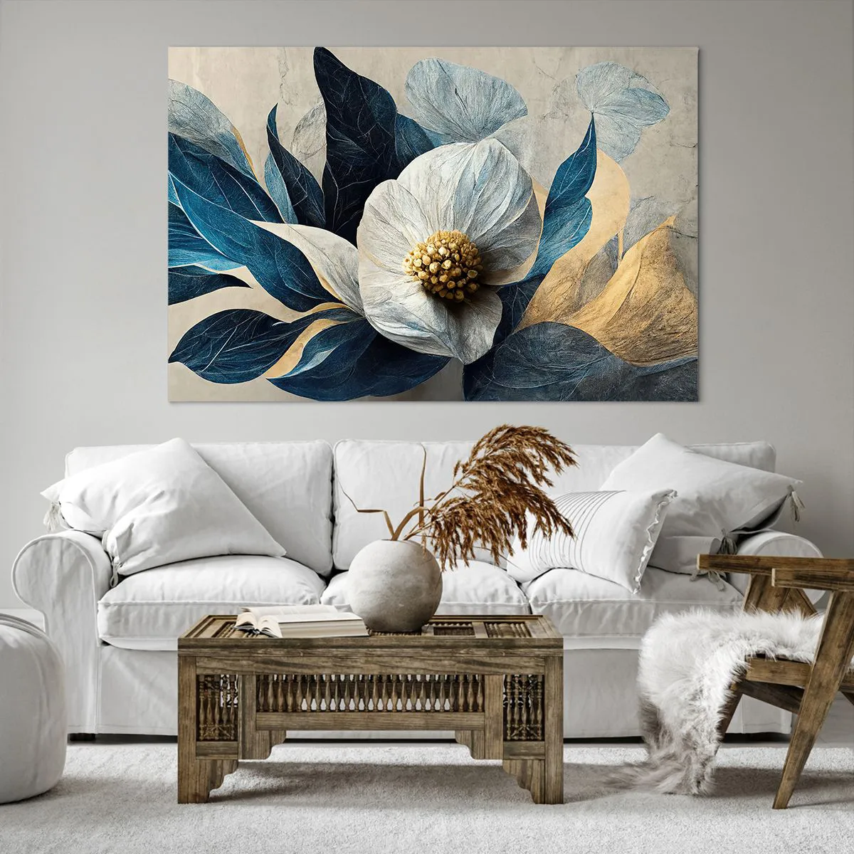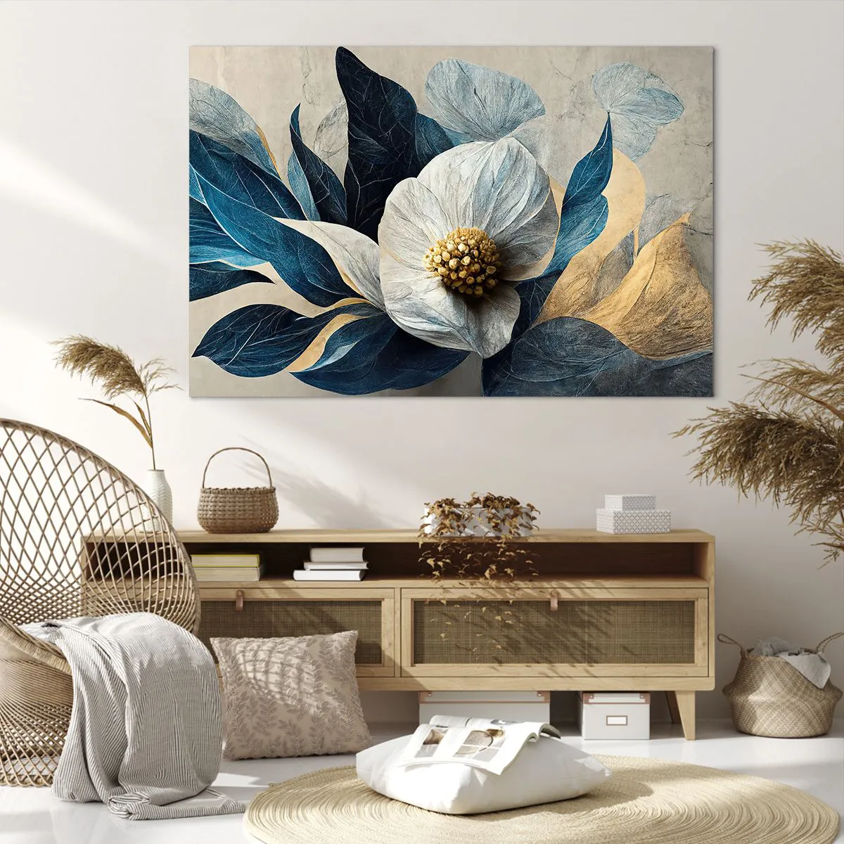 The canvas is stretched over the frame. The sides and edges of the picture are printed to form a continuation of the image. The painting is ready to hang on the wall. Each product comes with a hanger attached to the frame and a mounting kit (screw + wall plug).