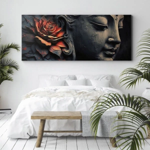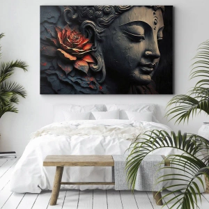 - The painting depicts a subtle sculpture of the Buddha with a distinct red lotus flower, symbolizing harmony and spirituality. It's an ideal decoration for lovers of Eastern culture and philosophy, bringing peace to any interior.
