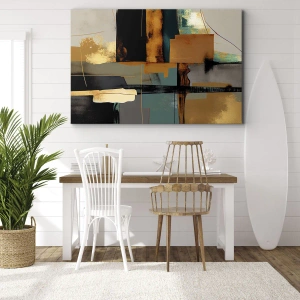 "Abstraction - Light and Shadow" is a painting that delights with its modern form and expressive composition. The abstract arrangement of shapes and colors combines shades of gold, turquoise, and black, creating a harmonious, yet dynamic whole. The minimalist style of the painting introduces a touch of luxury and sophistication to the interior, emphasizing its individual character.
