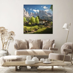 - picturesque mountain village at the foot of the Alps. Green meadows, traditional houses, and majestic peaks in the background create a harmonious composition. A perfect view that brings peace and natural beauty to the interior.