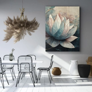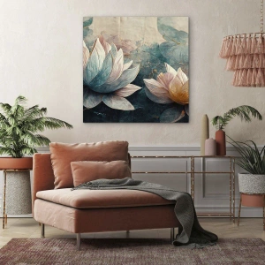 - This 70x50 cm canvas print depicts subtle water lilies in pastel shades of blue and gold. A perfect addition to any interior, it adds harmony and sophistication.