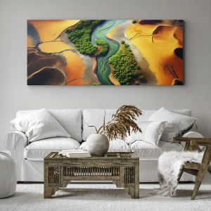 This painting is the perfect decoration for those who appreciate unique landscapes and natural motifs. "Life-Giving River" will work perfectly in a living room, bedroom, or office, giving the space a modern character and emphasizing its uniqueness. The contrast between green and golden shades of sand brings energy and peace to the interior at the same time.