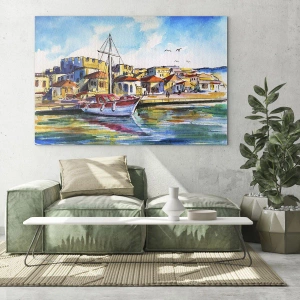 The architecture in the background is a harmonious juxtaposition of small houses with tiled roofs, defensive walls, and a seaside landscape, which, combined with a sailboat, creates a calm and dynamic image of a port town. The composition captures the spirit of Mediterranean resorts and creates the atmosphere of a warm afternoon. It is ideal for interior designs intended to evoke memories of vacation and relaxation.