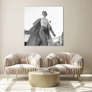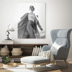 Glass art "Are you coming with me?" is a dynamic composition showing an elegant woman captured in motion in an urban landscape. The styling, relaxed gait, and flowing coat create an impression of independence and style. The black and white tones emphasize minimalism and add a classic character to the whole, while maintaining a contemporary feel.