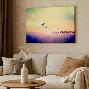 - This inspiring painting depicts a broken chain and birds soaring towards freedom against a pastel sunset. A perfect decoration, it carries symbolism of hope, freedom, and motivation.