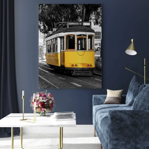 - A photograph of a yellow tram against a black-and-white street, reminiscent of Lisbon's charming alleyways. A perfect decoration for lovers of urban style and travel.