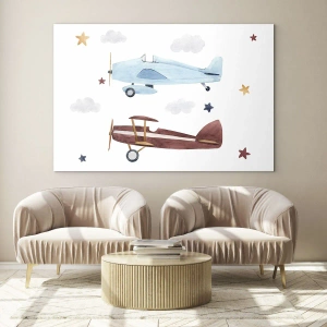 Glass Picture "Mr. Pilot, We're Waiting!" is a charming children's illustration depicting two planes - one blue, the other burgundy - flying among the stars and clouds. The composition, set against a white background, captures the lightness and joy of a child's imagination and passion for flying.