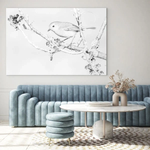 - A delicate black-and-white composition featuring a bird perched on a branch in a winter landscape. The minimalist nature of the painting brings a sense of calm and subtle elegance to the interior.