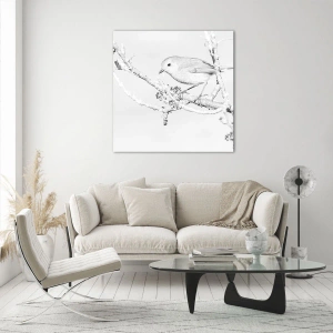 Glass picture - A bird perched on a branch in a monochromatic winter scene. - 70x50cm - Winter Morning - Modern wall decoration for the living room and bedroom ARTTOR