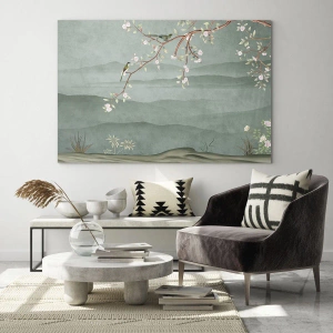 The graphic refers to the motifs of the Oriental style, in which nature and harmony play a key role. The delicate, blurred background reminiscent of mists hovering over the hills contrasts with the distinct branch and birds, creating a composition full of depth. Thanks to its subtlety, the painting doesn't dominate the space, but complements it, emphasizing the elegance of the interior.