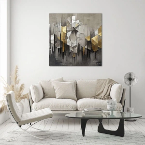 - The painting depicts irregular geometric shapes in shades of gray, white, and gold. Contrast and light and shade create a modern, dynamic composition with an industrial character.