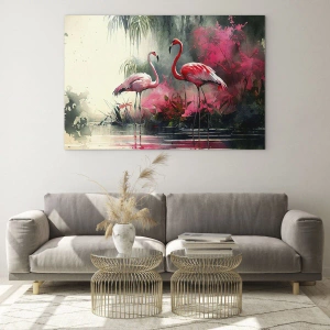 - The painting depicts two flamingos standing in water, surrounded by lush tropical vegetation. The delicate color palette, dominated by pink and green, creates a peaceful, harmonious atmosphere. The scene captivates with its subtlety and exotic charm.