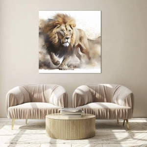 Glass picture - A dynamic watercolor-style shot of a running lion - 70x50cm - King is on the Move - Modern wall decoration for the living room and bedroom ARTTOR