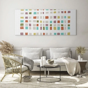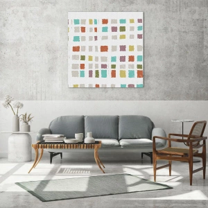 - An abstract composition composed of multicolored squares creating a rhythmic mosaic on a white background. A light and creative decoration for modern and minimalist interiors.