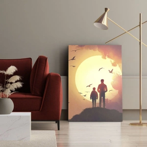 The canvas is stretched over the frame. The sides and edges of the picture are printed to form a continuation of the image. The painting is ready to hang on the wall. Each product comes with a hanger attached to the frame and a mounting kit (screw + wall plug).