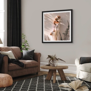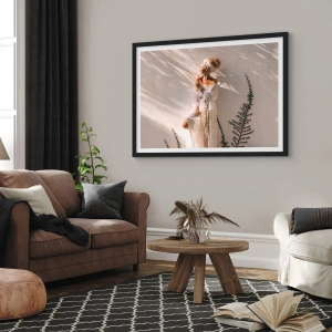 Poster in black frame - Stylish woman in a boho dress against a light wall - 50x70cm - Sun and Girl - Modern wall decoration for the living room and bedroom ARTTOR
