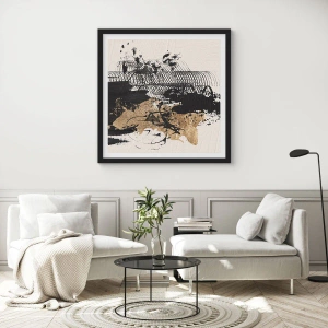 "Composition with Passion" is a modern poster that delights with its abstract form and richness of detail. The combination of deep black and subtle gold accents creates a refined and elegant composition, attracting attention with its dynamic structure.