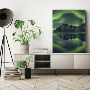 - A painting depicting mountains surrounded by the magical Northern Lights reflected in the water. An ideal decorative element to bring the harmony and beauty of nature to interiors.