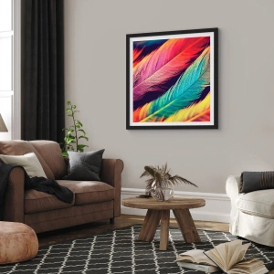 - This poster features colorful feathers in vibrant shades contrasting against a dark background. The detail and texture give it a sense of depth and elegance.