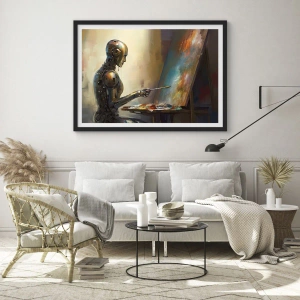 - modern poster depicting a robot painter working at an easel. The futuristic scene combines technology and art, creating an inspiring composition. A perfect decoration for lovers of modern and creative interiors. The poster is framed in a black frame.