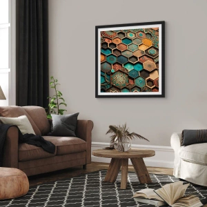 - modern poster featuring a geometric composition of hexagons in a gold and turquoise palette. Its exclusive aesthetic and precise details give it a unique character, making it the perfect accent for stylish interiors. The poster comes in a black frame.