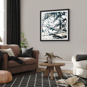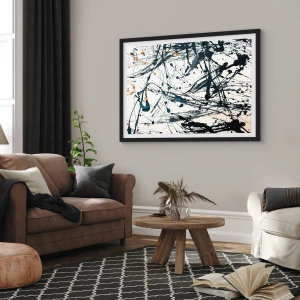 - The poster features expressive abstraction in the style of gestural painting. Dynamic lines and contrasting black and white splashes create a modern, energetic composition.