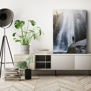 Canvas art "Restoring Proportions" is a majestic composition that captures the beauty and power of nature. It depicts a lone figure standing before a powerful waterfall that tumbles from high rocks, creating a dynamic and peaceful landscape.