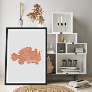 - The poster features a detailed illustration of a deep-sea fish in a rusty color, rendered with precise lines against a light background. The minimalist style and attention to detail give it an elegant, modern feel.