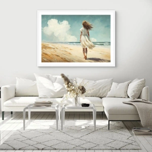 • girl, beach, walk, People, Nautical, Pastel, Landscapes, Travel, Art, For the office, For the study, For the dining room, For the bathroom, For the hall, For the living room, For the bedroom, White, Brown, Blue, Gray, Vertical