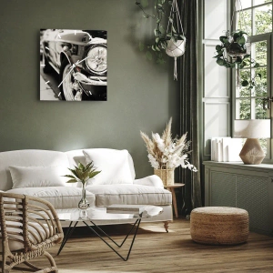 The dominant shades of black and white in the graphic are enriched with clearly marked flashes of chrome, which give the composition elegance and a strong, mechanical character. A close-up of the headlight and a fragment of the bodywork allows you to feel the atmosphere of bygone times and appreciate the craftsmanship of old designers. The painting combines vintage style with a modern presentation.