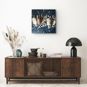 The "Taste of Hot Summer" Wall Clock is a sweet and stylish decorative piece that immediately brings to mind summer and childhood memories. Its dial features a delicious motif of chocolate, vanilla, and nut-covered ice cream sticks carefully arranged against a background of crushed ice. The color scheme of white, brown, and icy navy blue creates an aesthetic contrast and emphasizes the photo's realism.