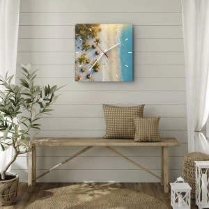 Wall clock - Clock on glass - Top view of the beach with palm trees and turquoise sea - 30x30cm - Welcome to Paradise - Modern wall decoration for the living room, kitchen, and bedroom ARTTOR