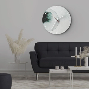 - wall clock with a subtle abstract composition, resembling a water drop with green accents. An elegant and minimalist design that will perfectly emphasize the character of modern and harmonious interiors.