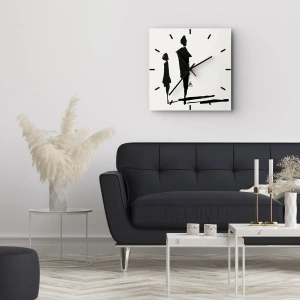 Wall clock - Clock on glass - Black silhouettes of two figures on a white background in a sketchy style. - 30x30cm - Surely Together? - Modern wall decoration for the living room, kitchen, and bedroom ARTTOR