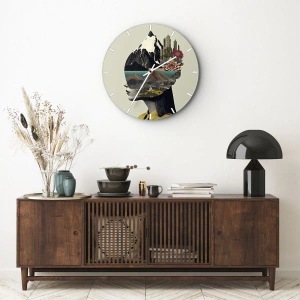 Wall clock - Clock on glass - Artistic portrait of a woman with a landscape and flowers in her head - 30x30cm - Woman - Always a Mystery - Modern wall decoration for the living room, kitchen, and bedroom ARTTOR