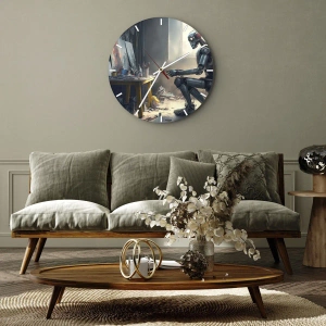 Wall clock - Clock on glass - A robot at a painting table in an art studio - 30x30cm - Act of Creation - Modern wall decoration for the living room, kitchen, and bedroom ARTTOR