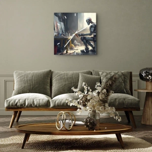 The entire scene, printed on a round 30x30 cm clock made of glass, attracts the eye and inspires. For many, it will be not only a timekeeping device but also a unique wall decoration – a personal gallery of contemporary art. The image depicts a moment of concentration when technology becomes a creator, provoking reflection on the future of art and the role of machines.