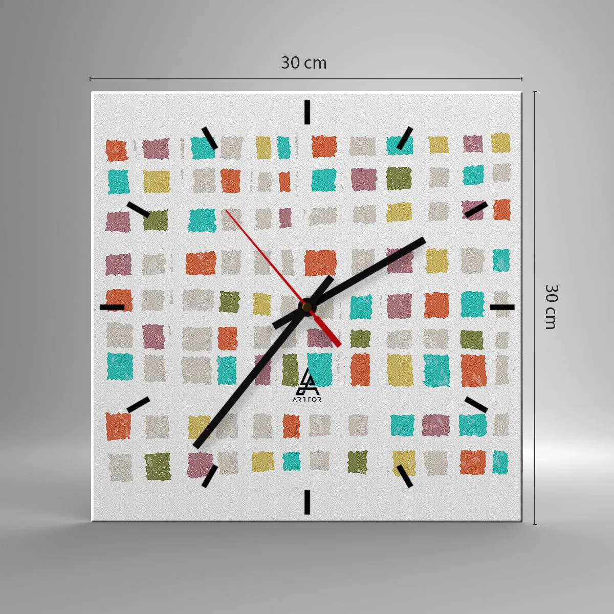 The clock is made of 4mm thick, safe glass. The clock's manufacturing technology complies with safety class 2B2 according to the PN-EN 12600:2004 standard, which guarantees impact resistance. The glass clock is ready to hang - it has a metal hanger attached to the back and a foam pad to regulate the even spacing of the clock from the wall. The clock has a silent mechanism powered by a 1.5V - AA battery (battery is not included).