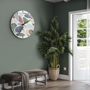 Wall Clock Mosaic of Powdered Colors is a unique decorative element that combines modern style with a delicate aesthetic inspired by nature. Its dial features irregular, organic forms in pastel shades of green, pink, blue, beige, and gray. The pattern resembles naturally arranged stones or leaves scattered on a light background.