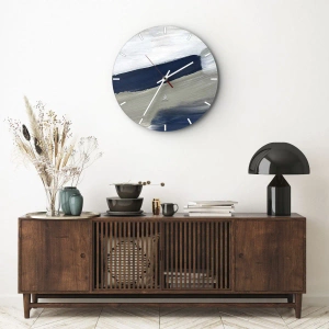 - This 30x30 cm wall clock features an abstract composition in shades of white and navy blue. Minimalist brushstrokes create a contrasting and modern motif.