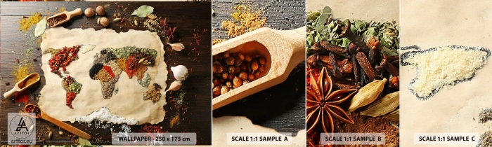 Photo Wallpaper Sample Standard Eco - All Flavours of the World - Gastronomy, World map, Dried Spices - 100x30 cm